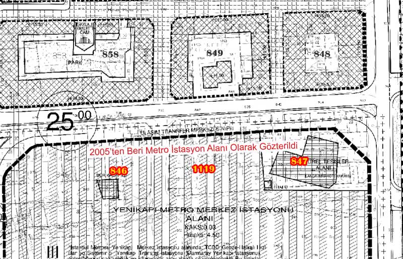 Yenikapı Metro istasyonu üstündeki 846-1119-847 nolu adalar 2005 yılından beri Metro alanına dahil gösteriliyordu. Mülk sahipleri yıllarca "İstimlak korkusu ile yaşadı" Birçoğu mülkünü YOK PAHASINA satarak mülkünü terk etti.