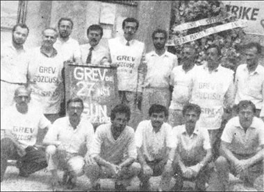 birlikte 'grev sözcüsü' önlüğü giymiş