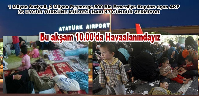 Çin'deki baskılardan kaçarak Türkiye'ye gelen aralarında hamile kadın ve çocukların da olduğu 35 Uygur Türkü, 17 gündür İstanbul Atatürk Havaalanı'ndan TÜRKİYE ye giriş yapamıyor. Duyarlı Türk Milletini Atatürk Havaalanında Dış İşleri Bakanlığı’nı protesto etmeye davet ediyoruz. Değerli basın mensupları bu çifte standartı Türk Halkına duyurma çabalarımıza desteklerinizi bekleriz.