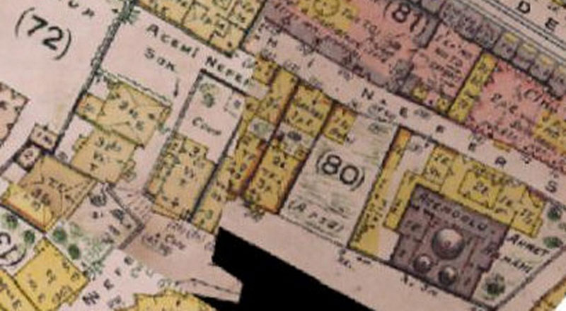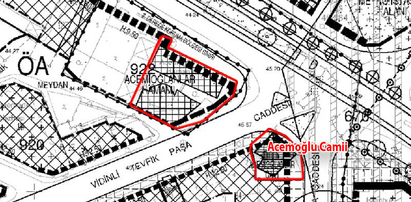 Vidinli Tevfikpaşa caddesi cepheli 918 ada, 46 parselde 2005 planlarında görülen Acemi Oğlanlar Camii 2012 planlarında yok edilmiş olduğunu görüyorsunuz.