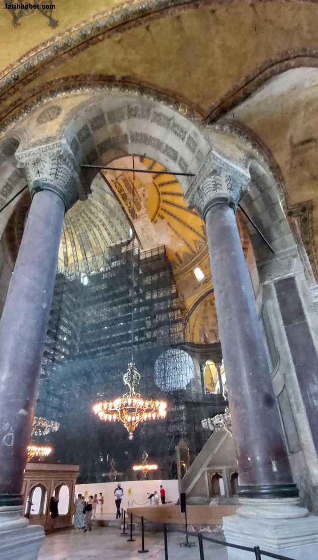 Söz konusu iskele, ve ilaveten gene bir faaliyetin görülmediği Ana salonda ve kuzey doğu revak duvarlarını boydan boya kaplayan beyaz muşamba perde ile örtülmesi Ayasofya’yı izlemeye gelenleri hayal kırıklığına uğratıyor.