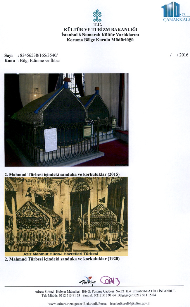 Mevcut ugulamanın kabul edilemez olduğunu görüyoruz, Biz genede türbenin eski fotoğrafını aramaya devam edeceğiz, Bu konuda Koruma kurulumuza ve Türbe vakfına yardımcı olmuş oluruz