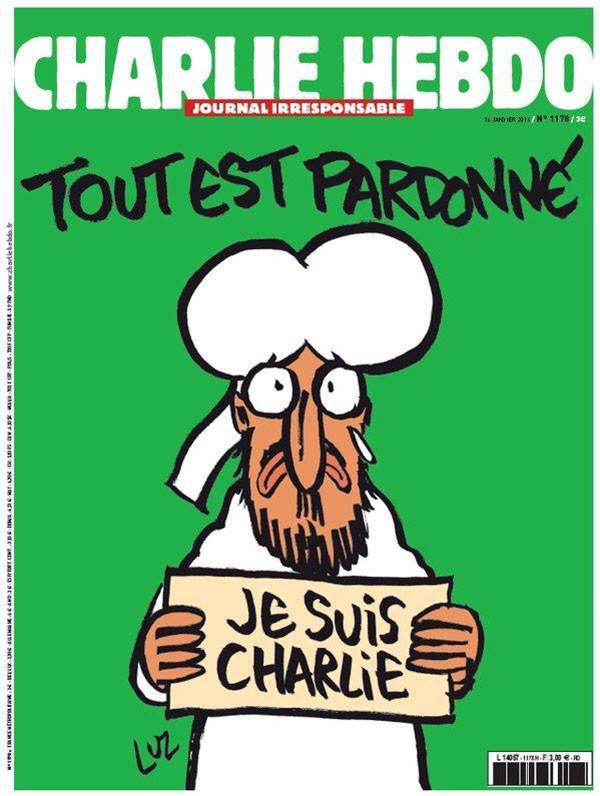 Geçen hafta meydana gelen 12 kişinin öldüğü saldırının ardından derginin ilk sayısının kapağında Hz. Muhammed yer alacak. Kapakta, gözü yaşlı Hz. Muhammed büyük harflerle ‘Ben Charlie'yim’ yazılı bir dövizi tutuyor, üstte ise yine büyük harflerle ‘her şey affedildi’ yazıyor.