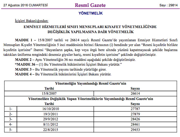Buna göre, yönetmeliğin 5'inci maddesinin 1. fıkrasının (i) bendinde yer alan “Resmi kıyafetle birlikte kıyafetin içerisine” ibaresi, “Bayanların şapka, kep veya örgü bere altında yüzünü kapatmayacak şekilde başlarına taktıkları üniforma rengindeki desensiz giysiler hariç, resmi kıyafetin içerisine” şeklinde değiştirildi.
