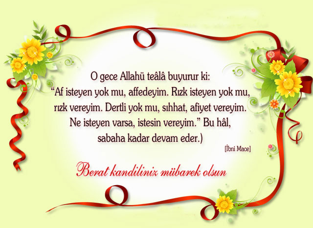 (Allahü teâlâ şu dört geceyi hayırla süsler: Kurban Ramazan bayramı gecesi, Arefe gecesi Şabanın yarısının [Berat] gecesi ki, onda eceller, rızıklar yazılır.) [Deylemi]