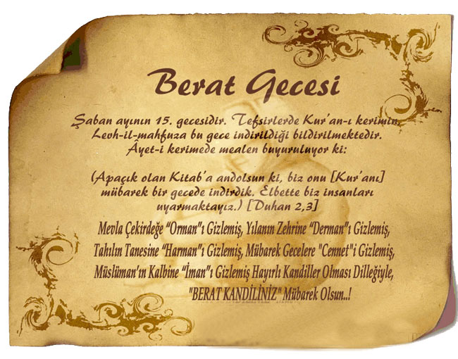 Berat Gecesi, Şaban ayının 15. gecesidir Tefsirlerde Kur’an-ı kerimin, Levh-il-mahfuza bu gece indirildiği bildirilmektedir. Âyet-i kerimede mealen buyuruluyor ki: