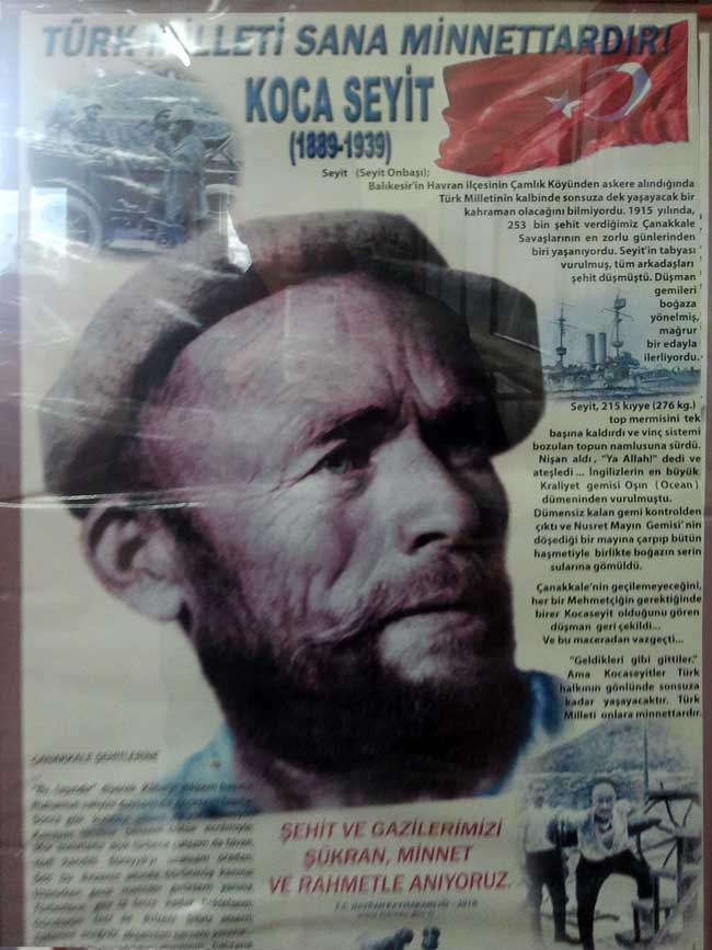 Seyit, 276 kiloluk bir mermiyi, mataforası yani vinci bozuk olan topçu bataryasına tek başına sırtlayarak yerleştirmeyi başarır.
