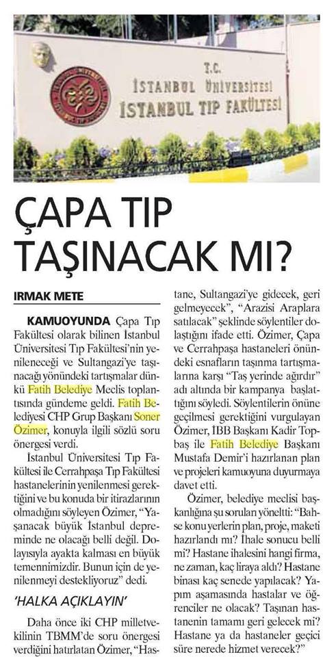 CHP Fatih ilçe başkanı Soner Özimer 11 Mart 2016 Cuma Günü Fatih belediyesi meclisinde bir soru önergesi ile Tıp fakültelerimizin akıbetini Başkan Mustafa Demirden sordu. "Video haber Aşağıda)
