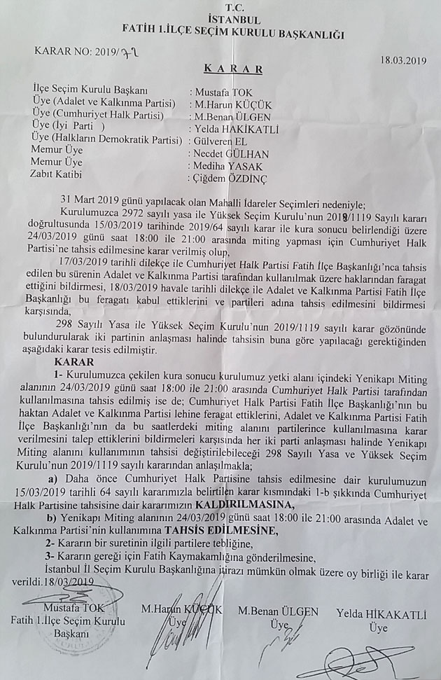 Fatih CHP İlçe yönetimi 31 Mart yerel seçimlerinin finali sayılan 24 Mart pazar günü 18-21 saatleri arası Yenikapı miting kurası kendisine çıkmasına rağmen Chp fatih ilçe yönetimi Bu saatteki miting hakkını Ak partiye devretti İl seçim kurulu tarafından bu saatteki miting hakkı Ak partiye devredildi. BU ŞEKİLDE KARAR VERİLMESİ İBB BAŞKAN ADAYI EKREM İMAMOĞLUNA KARŞI BÜYÜK BİR DARBE OLMUŞ OLDU