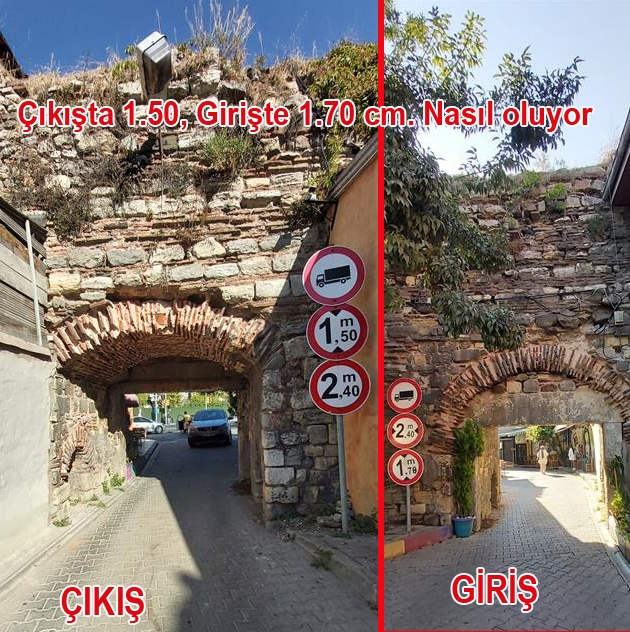 Kapı girişinde 1.70 olan yükseklik kapı çıkışında 1.50 olarak yazılmış Kamyonet trafiğine ise yasaklanmamış görülüyor.