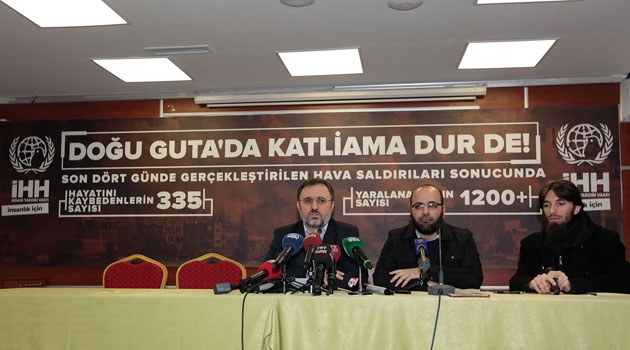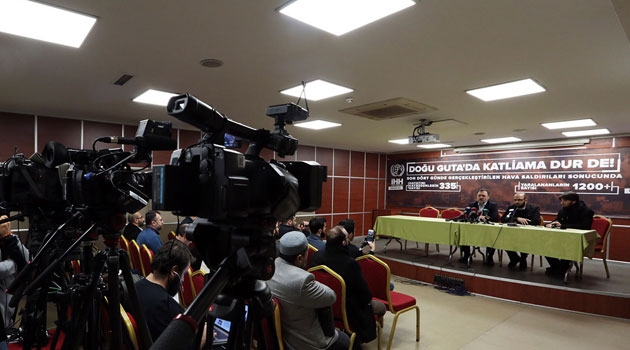 Doğu Guta’da yaşanan katliamlara dur demek amacıyla İHH İnsani Yardım Vakfı Genel Merkezi’nde bir basın toplantısı düzenlendi. Toplantıya, kısa bir süre önce Doğu Guta’dan çıkmayı başaran yardım görevlilerinin yanı sıra çok sayıda basın mensubu katıldı.