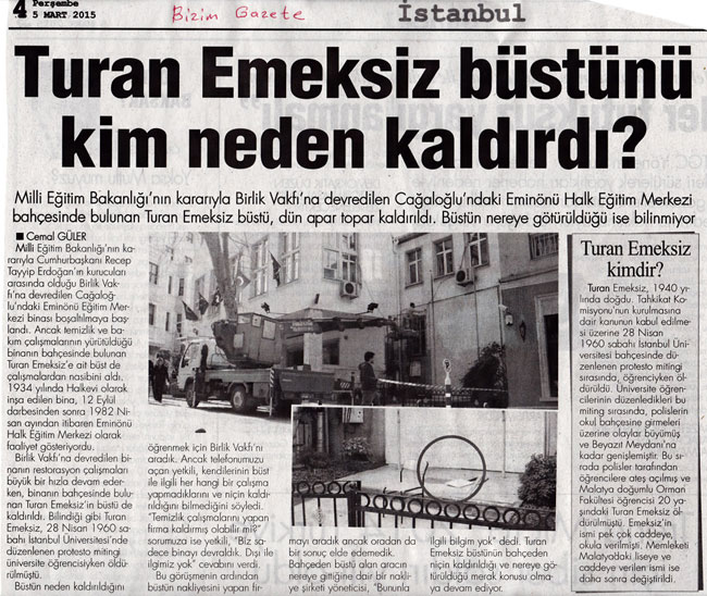 Bizim gazetenin haberinde, (bu gazetede. TGC’nin-Gazeteciler cemiyeti) “Milli Eğitim Bakanlığı’nın kararıyla Birlik Vakfı’na devredilen Cağaloğlu’ndaki Eminönü Halk Eğitim Merkezi bahçesinde bulunan Turan Emeksiz büstü, dün apar topar kaldırıldı. Büstün nereye götürüldüğü ise bilinmiyor” denildi. Birlik Vakfı, AKP’ye yakınlığıyla biliyor.