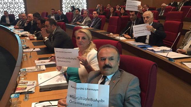 Bu olayların üstünü örtmeyin demek istedi. Bakanınız Reza Sarraf ‘un önüne yatarım dedi. Bu söylemi kullandı Genel Başkanımız. Gürültü ile bu olayı susturamayacaksınız. Sizler Reza Sarraf ABD’de ifade veriyor. O zat-ı muhteremin önüne yatınca kınamadınız ? Sizler bir seferden bir şey olmaz deyince kınamadınız ? Sizler kadınlarımızın kaç çocuk doğurması gerektiğine karıştınız ? Siz kadınları düşüren müteahhitlere kızamadınız , ortanca hanım diyor kınamadınız ? 9 yaşındaki çocuklar şehvet uyandırır diyen Diyaneti kınadınız mı ? Şehidimize kelle diyenleri, Ananı da al git diyenleri kınadınız mı ? İki ayyaş diyenleri kınadınız mı ?