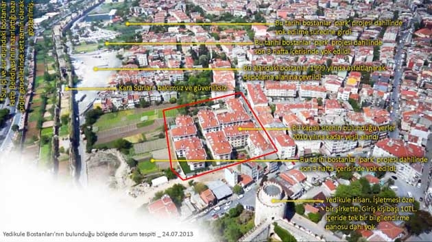 Fatih belediyesinin Yedikule Bostanları için yapamayacağı şey yok. Bütün imar hukuku mevzuatına aykırı bir şekilde (Yeşil Alana) inşa edilen Yedikule konakları Surlarla arasında kalan kamusal alanı otopark ve sosyal donatı alanı olarak zimmetlerine geçirmek için birkaç defa girişimde bulundular.