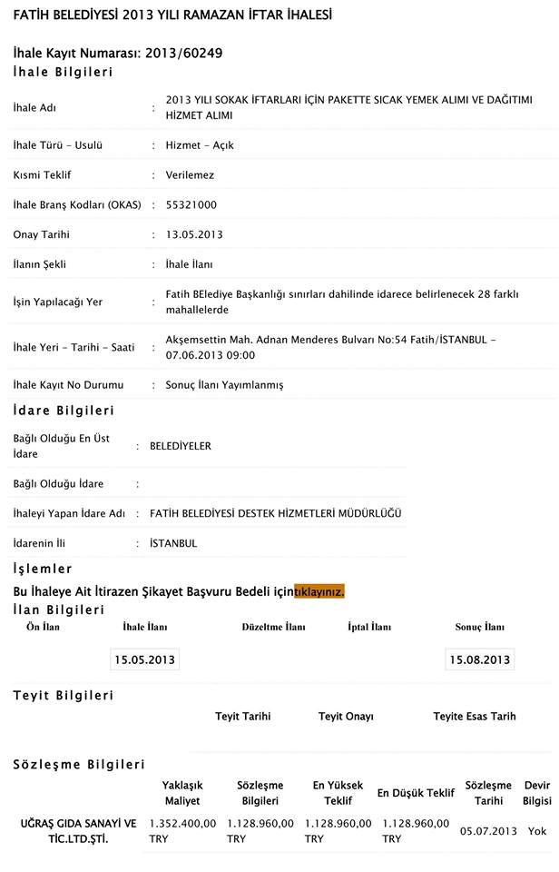 Fatih Belediyesi, 2013/60249 ihale kayıt no ile, 1 TRİLYON 350 MİLYAR (Eski Paraya Göre) bütçe karşılığında, 28 mahallede toplam 168 bin kişiye İFTAR YEMEĞİ verdi.