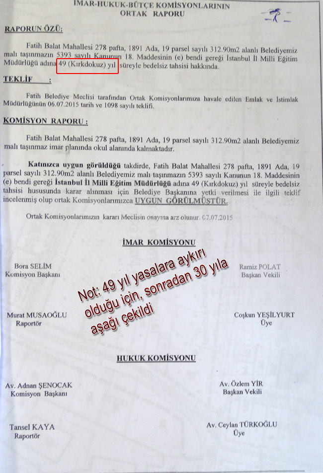 Mevcut tahsisin yapılmasında komisyon kararlarında 49 yıl olarak yazılması Fatih belediye meclisinde durumun günün hukukan göre 30 yıla "hukuksuz" geri çekilmesine CHP gurubu karşı çıktı, Önergenin geri çekilmesini talep etti.