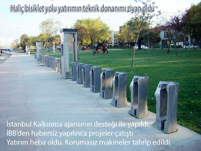 İBB den habersiz yapılan bir proje ile Kalkınma bankası, İstanbul kalkınma ajansından alınan kredi ile gerçekleştirilen Haliç bisiklet yolu, Kiralık bisiklet otomatları kaderine terk edilince çoluk çocukların oyun alanı oldu, aparatların elektronik donanımları söküldü, kırıldı, çalındı.