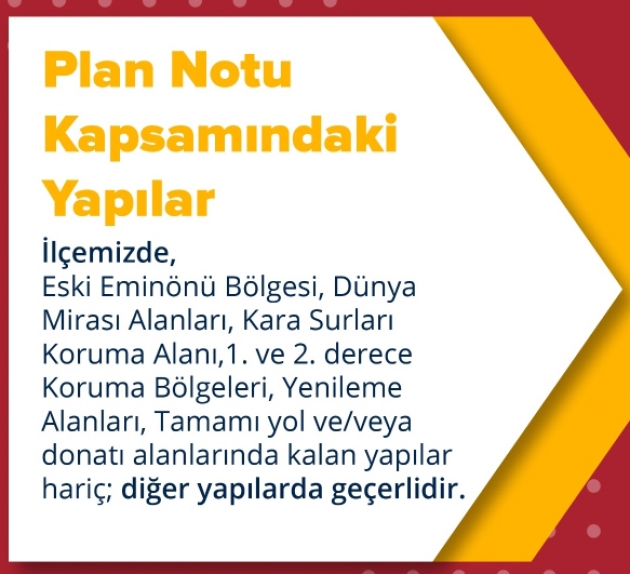 • Meri koruma amaçlı uygulama imar planında; Dünya Mirası Alanları, Kara Surları Koruma Alanı, 1. ve 2. derece koruma bölgeleri ile 5366 sayılı yasa kapsamında Bakanlar Kurulu kararı ile yenileme alanı olarak ilan edilen alanlarda, Eminönü bölgesinde(Molla Fenari, Hoca Gıyasettin, Demirtaş, Mercan, Mimar Hayrettin, Yavuz Sinan, Süleymaniye, Sarıdemir, Tahtakale, Hocapaşa, Balabanağa, Rüstempaşa, Saraç İshak, Mimar Kemalettin, Küçük Ayasofya, Molla Hüsrev, Kalenderhane, Kemalpaşa, Beyazıt, Alemdar, Emin Sinan, Muhsine Hatun, Şehsuvar Bey, Kâtip Kasım, Sultanahmet, Binbirdirek, Mesihpaşa, Taya Hatun, Sururi, Hacı Kadın, Hobyar, Cankurtaran, Nişanca Mahalleleri) ve tamamı yol ve/veya donatı alanlarında kalan yapılar hariç olmak üzere;