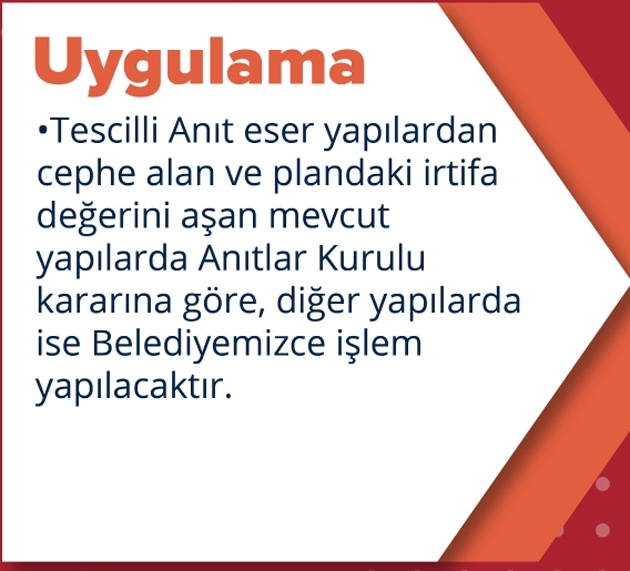 • Bu madde kapsamında lejantta ‘Korunması Gerekli Tescilli Arkeolojik Tarih Sanat Değeri Olan Anıt Eser Yapılar’ taraması bulunana yapılara (çeşmeler hariç) cephe veren ve meri’i imar planındaki irtifa değerlerini aşan yapılarda Kurul kararına göre uygulama yapılır.