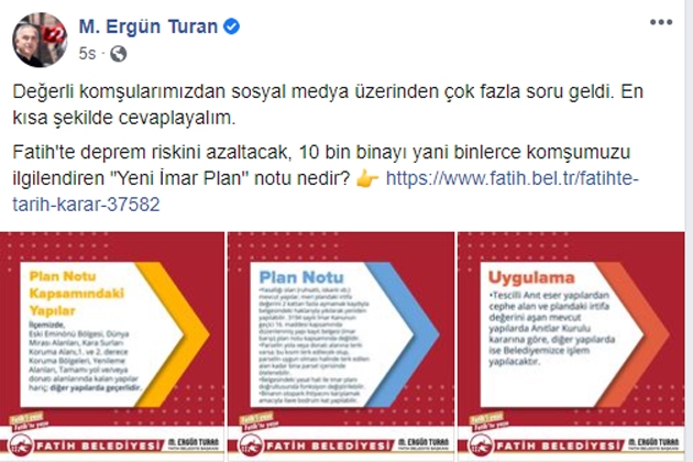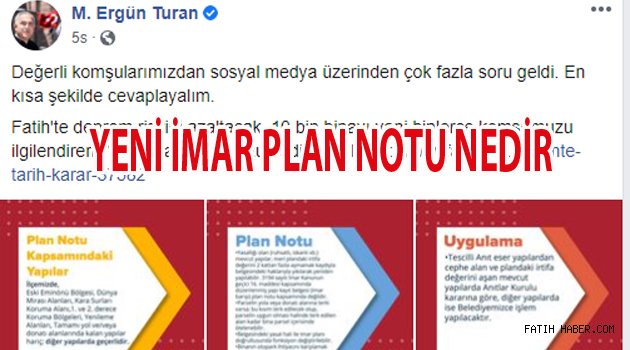 Konuyla ilgili bir açıklama yapan Fatih Belediye Başkanı M. Ergün Turan; “Fatih’te yıllardır beklenen bu kararın üzerine biz yaklaşık 1 yıldır çalışıyorduk. Bu karar hem Fatih Belediye Meclisi, hem İstanbul Büyükşehir Belediye Meclisi hem de Koruma Kurulu’ndan oy birliğiyle geçmiş bir karardır. Kimsenin itirazı olmadı çünkü bu karar Fatih’te yaşamak isteyen insanların bu yaşam haklarını koruyacak, onların evlerini yenilemesine fırsat tanıyacak bir plan notu. Eminönü bölgemiz ile anıt eserler ve tescilli yapılar bu plan notunun dışındadır” dedi.