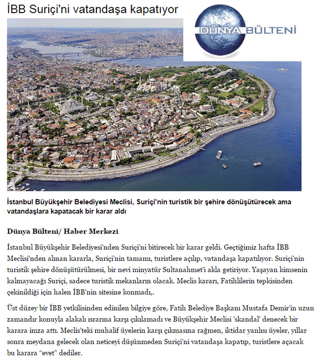 İstanbul Büyükşehir Belediyesi'nden Suriçi’ni bitirecek bir karar geldi. Geçtiğimiz hafta İBB Meclisi'nden alınan kararla, Suriçi’nin tamamı, turistlere açılıp, vatandaşa kapatılıyor. Suriçi'nin turistik şehire dönüşütürülmesi, bir nevi minyatür Sultanahmet'i akla getiriyor. Yaşayan kimsenin kalmayacağı Suriçi, sadece turistik mekanların olacak. Meclis kararı, Fatihlilerin tepkisinden çekinildiği için halen İBB'nin sitesine konmadı,.