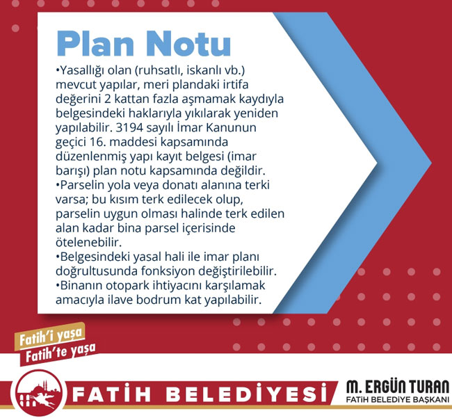 Konuyla ilgili bir açıklama yapan Fatih Belediye Başkanı M. Ergün Turan; “Fatih’te yıllardır beklenen bu kararın üzerine biz yaklaşık 1 yıldır çalışıyorduk. Bu karar hem Fatih Belediye Meclisi, hem İstanbul Büyükşehir Belediye Meclisi hem de Koruma Kurulu’ndan oy birliğiyle geçmiş bir karardır. Kimsenin itirazı olmadı çünkü bu karar Fatih’te yaşamak isteyen insanların bu yaşam haklarını koruyacak, onların evlerini yenilemesine fırsat tanıyacak bir plan notu. Eminönü bölgemiz ile anıt eserler ve tescilli yapılar bu plan notunun dışındadır” dedi.