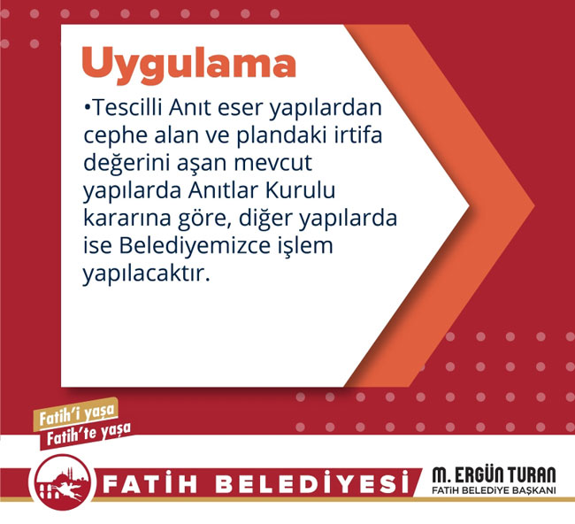 Evlerini yenilemek isteyen vatandaşlarımızın evlerini yenilemelerine fırsat tanıyan ve onların mevcut haklarını kendilerine iade eden, Fatih için büyük bir önem taşıyan bu karar, ilçedeki yaklaşık 10 bin binayı kapsıyor.