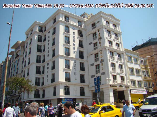 909 ve 910 adaların yasal yüksekliği 15.50 metre, Geçmişte birçok parselde yasalara aykırı yapılaşma ile binalar sekiz kata kadar çıkarılmış (8x3=24 metre)