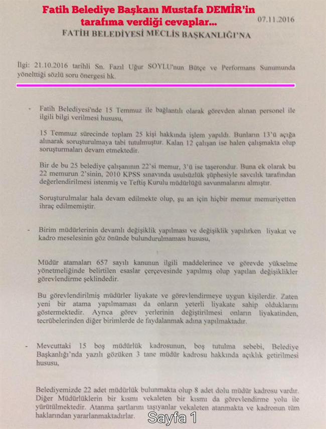 Fazıl Uğur Soylu'nun soru önergesi ile öğrenmiş olduk ki, 15 Temmuz darbe girişiminden sonra Fatih belediyesinde 22 memur 3 taşörön hakkında soruşturma açılmış. Bunlardan 13 kişi açığa alınmış, diğerleri hakkında soruşturma devam ederken görevlerinin başında olduklarını öğrendik.