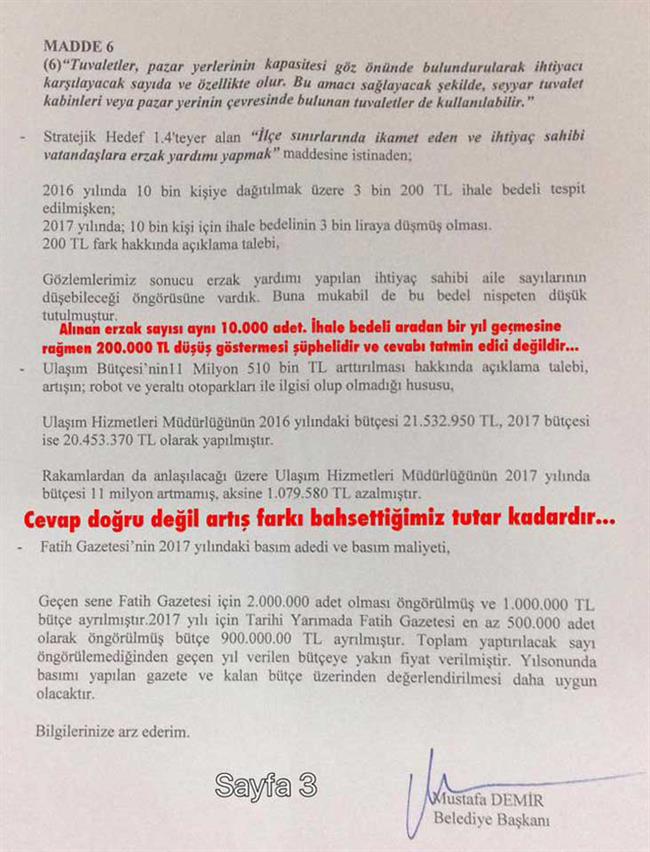 Fatih Belediye meclisinde verdiği Sözlü/Yazılı soru önergelerine verilen cevaplar.