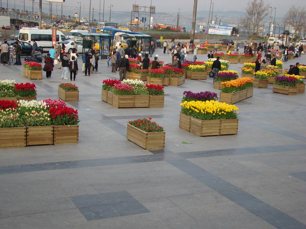 indirilen, içinde lale çiçekleri olan dev saksılar