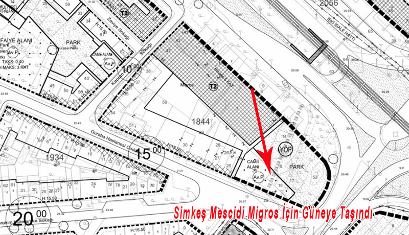 Parseli dahi küçültülmüş, caminin tescilli yerine ise büyükçe bir AVM planlanmış olduğunu görüyoruz.