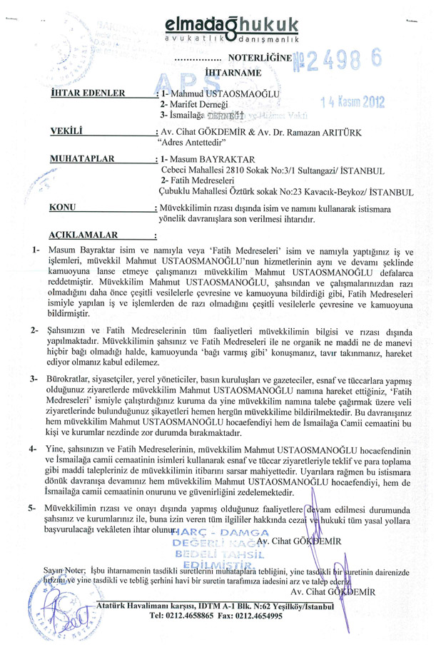 rahatsız etti. Bunun üzerine Noter’den tasdikli ihtarname