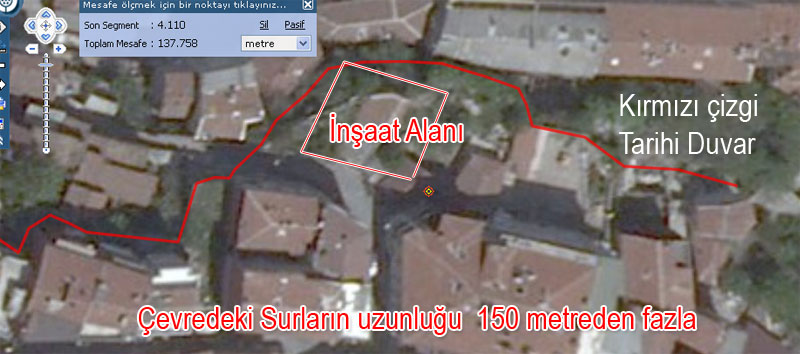 Görüldüğü gibi binayı ve alanı çevreleyen tarihi duvar 150 metreden