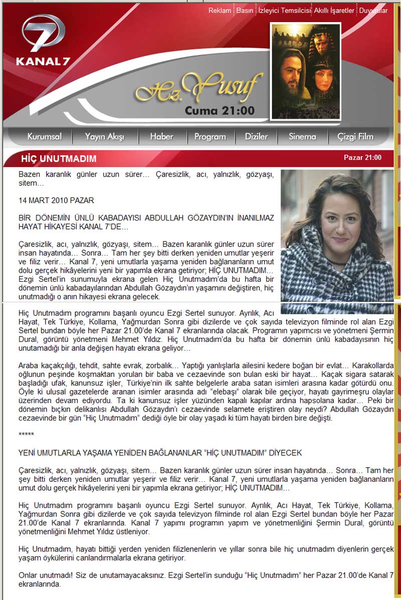 öğleden sonra İnternet sitenizde “Hiç Unutmadım” programının