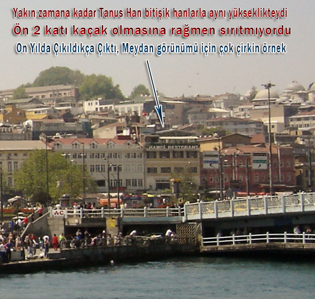 Eminönü 385 ada 27 parsel Tanus Han Tescilli sivil mimarlık örneği olmasına rağmen Bitişiğindeki Çavuşbaşı han 3 kat Tanus han ön cephesi iki katlı olduğu halde günümüzde Çavuşbaşı hen tarihi kimliğini oldukça korurken H 1272 - M 1855 tarihli Tanus handa faaliyet gösteren lokanta işletmesi son on yıl içinde yükseldikçe yükseldi, Tarihi eminönü meydanının en çirkin binası haline geldi.