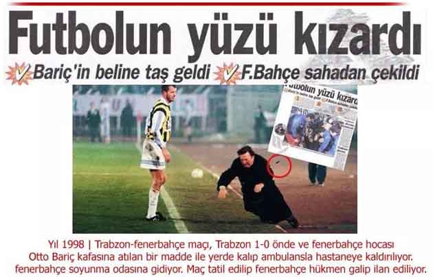 Yıl 1998 | Trabzon-fenerbahçe maçı, Trabzon 1-0 önde ve fenerbahçe hocası Otto Bariç kafasına atılan bir madde ile yerde kalıp ambulansla hastaneye kaldırılıyor. fenerbahçe soyunma odasına gidiyor. Maç tatil edilip fenerbahçe hükmen galip ilan ediliyor.