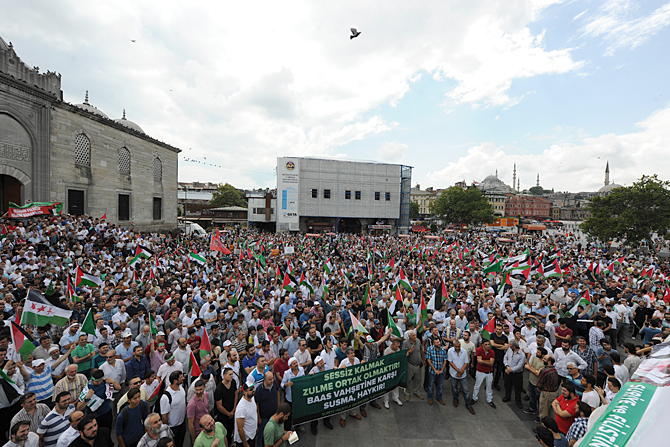 Gazzeli Müslümanlarla dayanışma eylemleri bu Cuma da büyük kitleleri bir araya getirdi. İstanbul’da bu hafta Cuma namazı için seçilen adres Yeni Cami oldu. Yeni Cami’de kılınan Cuma namazı sonrasında Eminönü Meydanında toplanan kadın-erkek binlerce Müslüman Gazze ile birlikte Suriye direnişini de selamladı.
