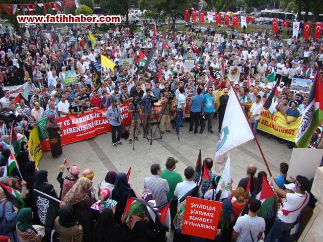 Kılınan cenaze namazı sonrası Fevzipaşa Caddesi’nden “Kahrolsun İsrail- kahrolsun Amerika, Hamas’a selam direnişe devam, Vur vur Hamas vur israil’e vur, İstanbul’dan Gazze’ye direnişe bin selam, Direne direne kazanacağız, Terörist İsrail hesap verecek, Canımız kanımız feda olsun Aksa’ya, Muhammed’in ordusu kâfirlerin korkusu, Direniş şehadet özgürlük” sloganları eşliğinde yürüyüşe geçen yüzlerce kişi Saraçhane Fatih Parkı’na gelerek burada bir basın açıklaması yaptı.