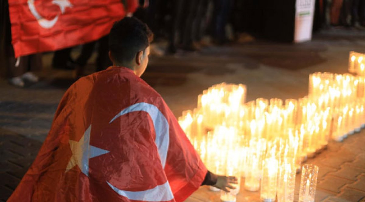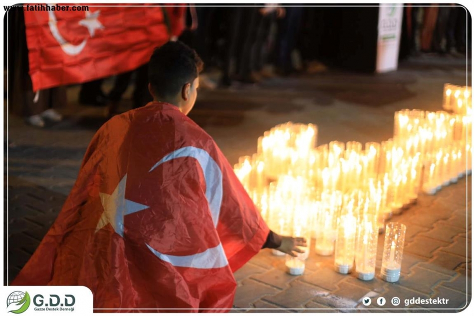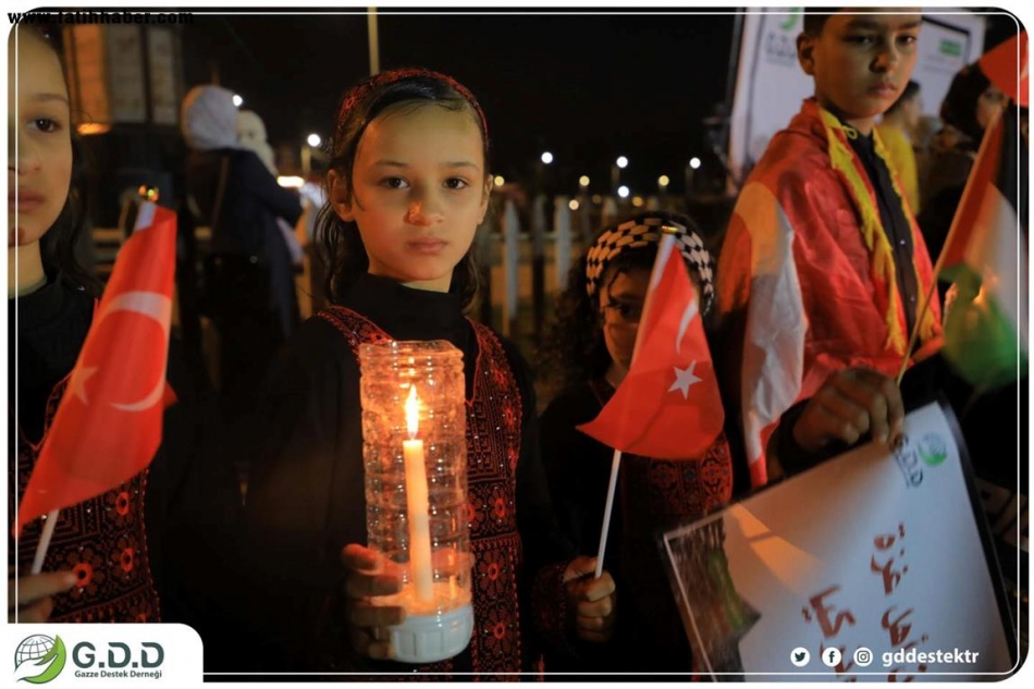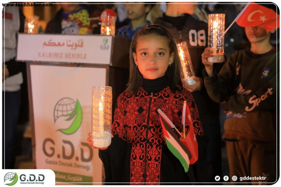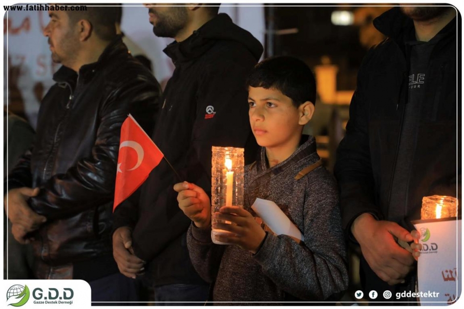 Gazze Limanındaki Marmara gemisinde şehitler anıtı yakınında "Kalbimiz sizinle" yazılı mumlar yakan onlarca Filistinli çocuğumuz, Filistin halkından insani bir mesaj olarak Türk bayrağını dalgalandırarak acılarını ve üzüntülerini dile getirdi.