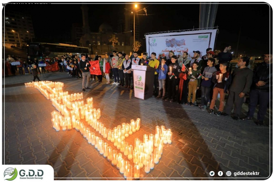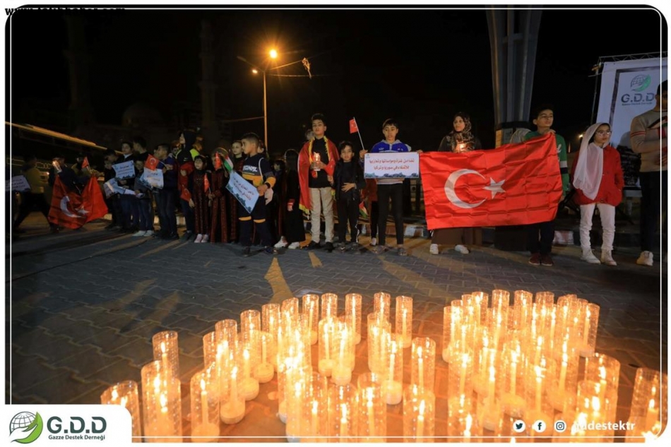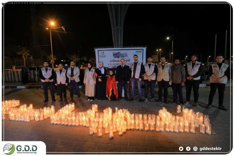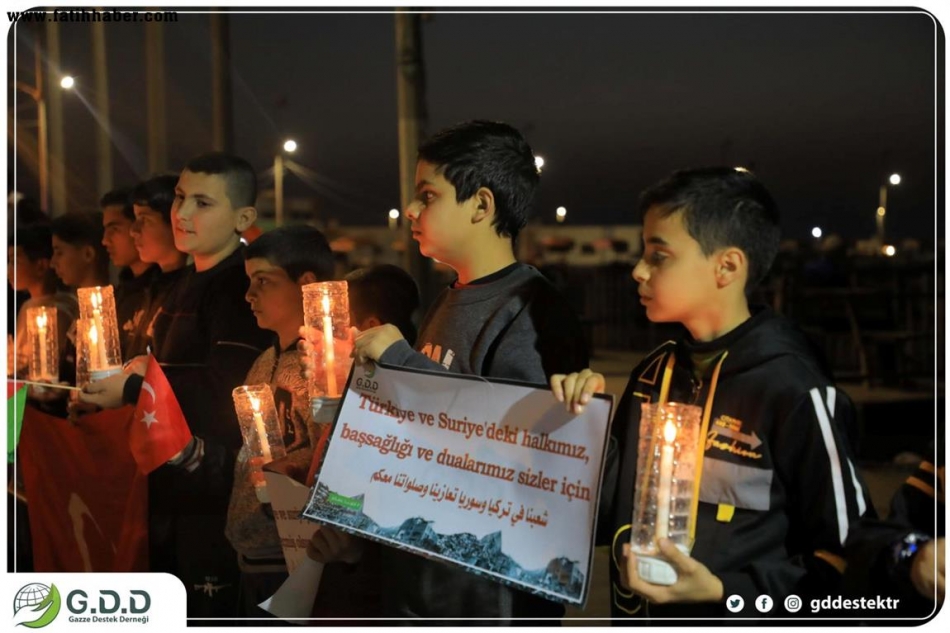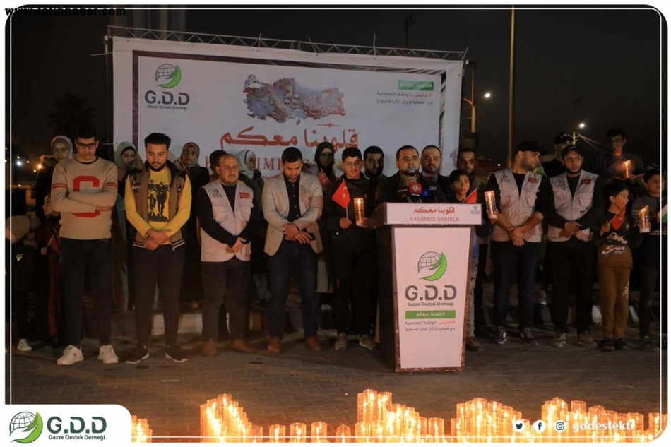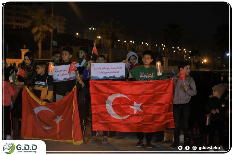 Gazze Destek Derneği, geçen ay Türkiye'nin güneyi ve Suriye'nin kuzeyini vuran yıkıcı depremde hayatlarını kaybedenlerin aileleri ve zarar görenlerin acılarını anmak için bu gece Gazze Şeridi'nde "Kalbimiz seninle" başlığıyla bir dayanışma toplantısı düzenledi.