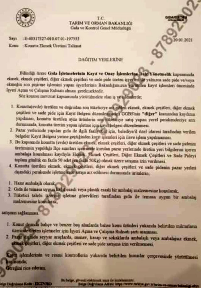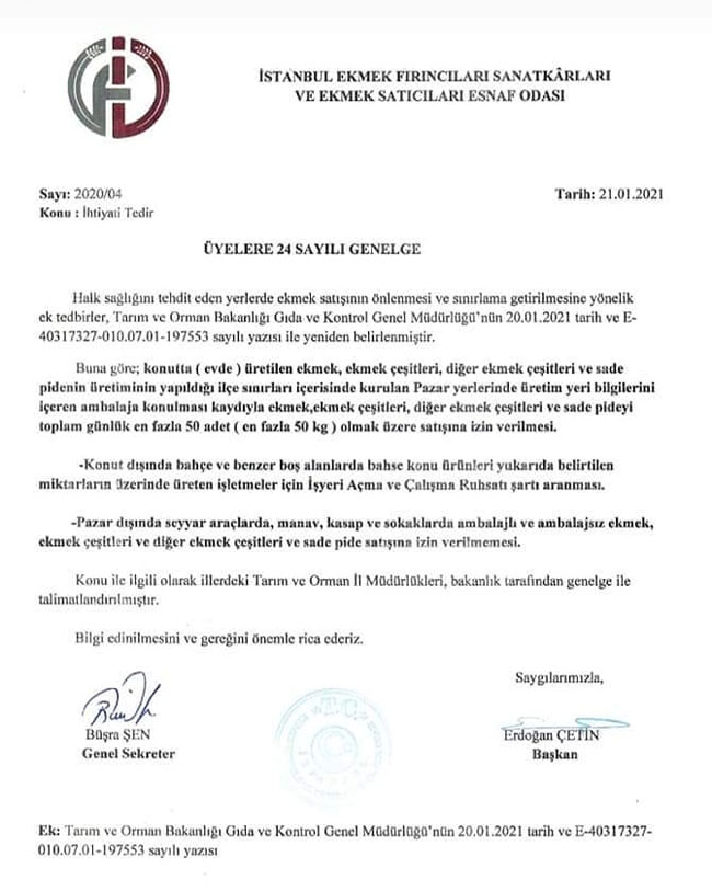 Tarım ve Orman Bakanlığı, pazarlar dışında seyyar ekmek satışını yasaklayan bir genelge yayınladı. Genelgeye göre, mobil araçlarda ekmek satışı yasaklandı.Yayınlanan genelge ile birlikte artık pazarlar dışında seyyar araçlar ve mobil araçlar ile manav, kasap ve sokaklarda ambalajsız veya ambalajlı ekmek, diğer ekmek çeşitleri ve pide satışı yapamayacak.