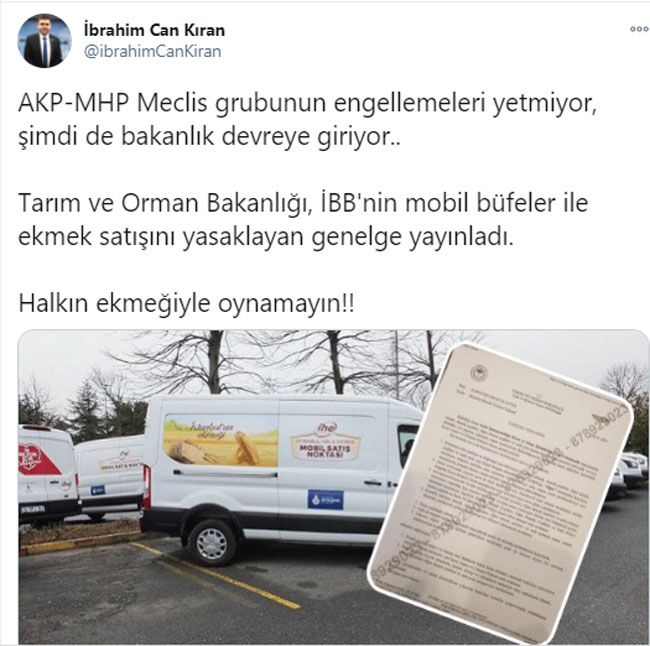 Halk ekmeğin mobil dağıtım hizmetine tarım Bakanlığından yasak geldi İBB meclisinde Ak parti ve MHP oyları ile Halk ekmek büfelerinin yaygınlaştırılmasını engelleyen Muhalefet İBB nin mobil uygulaması ile aşılmıştı. Burada Tarım bakanlığı devreye girerek yayınladığı genelge ile mobil ekmek dağıtımını yasakladı ..