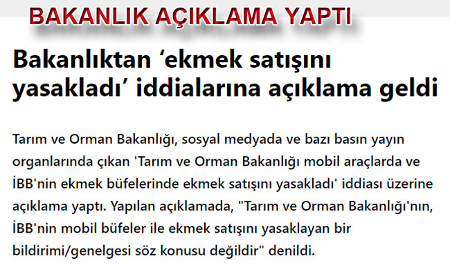 Tarım ve Orman Bakanlığı, ekmek satışına ilişkin yayımladığı bir genelge ile mobil araçlarda ekmek satışını yasakladığını belirtti. Bakanlığın genelgesi, İBB'nin mobil ekmek büfelerinde de ekmek satışının yasaklandığı şeklinde yorumlandı. Tarım ve Orman Bakanlığı'ndan daha sonra yapılan açıklamada ise, "İBB’nin mobil büfeler ile ekmek satışını yasaklayan bir genelgemiz söz konusu değildir" açıklaması yapıldı. İmamoğlu’ndan 'Halk Ekmek' açıklaması: Tarım Bakanlığı İBB'yi kastetmediğini ifade etti, sorun çözüldü SON DAKİKA: TARIM BAKANLIĞI SÖZ KONUSU GENELGEYE RAĞMEN İBB EKMEK DAĞITIM ARAÇLARININ YASAKLANDIĞI HABERLERİNİ YALANLADI FIRINCILAR ODASI HALK EKMEĞİN TAMAMEN KALDIRILMASINI TALEP ETTİ