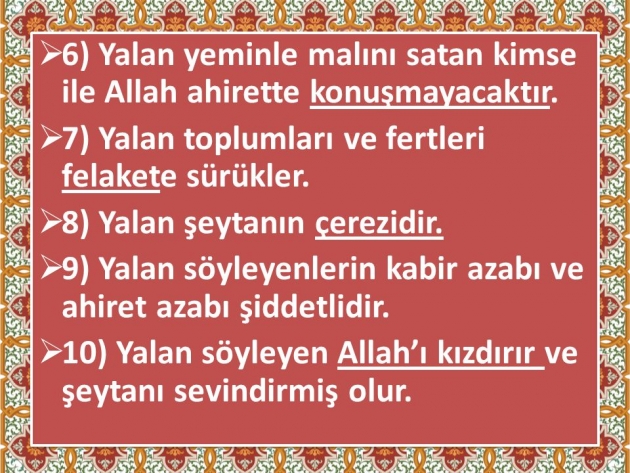 Ara sırada olsa Yalana başvuruyormusunuz? Artık Huzur, Mutluluk, Sadakat, Güven sizin kapınızdan geçmez. Haramların 1. si Yalandır. Yalanı terk etmeyen ve Namussuzluk olarak görmeyen toplumlar yok olmaya mahkumdur. Yalanı nerede görüyorsanız gücünüz yetiyorsa elinizle, Ona gücünüz yetmiyorsa dilinizle mani olun, Buna da gücünüz yetmiyorsa Buğuz edin, yalancıdan nefret edin, Hiçbir menfaatini kabul etmeyin, Hiçbir derdine inanmayın, hiçbir vaadi sizi merhamet etmeye götürmesin.