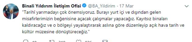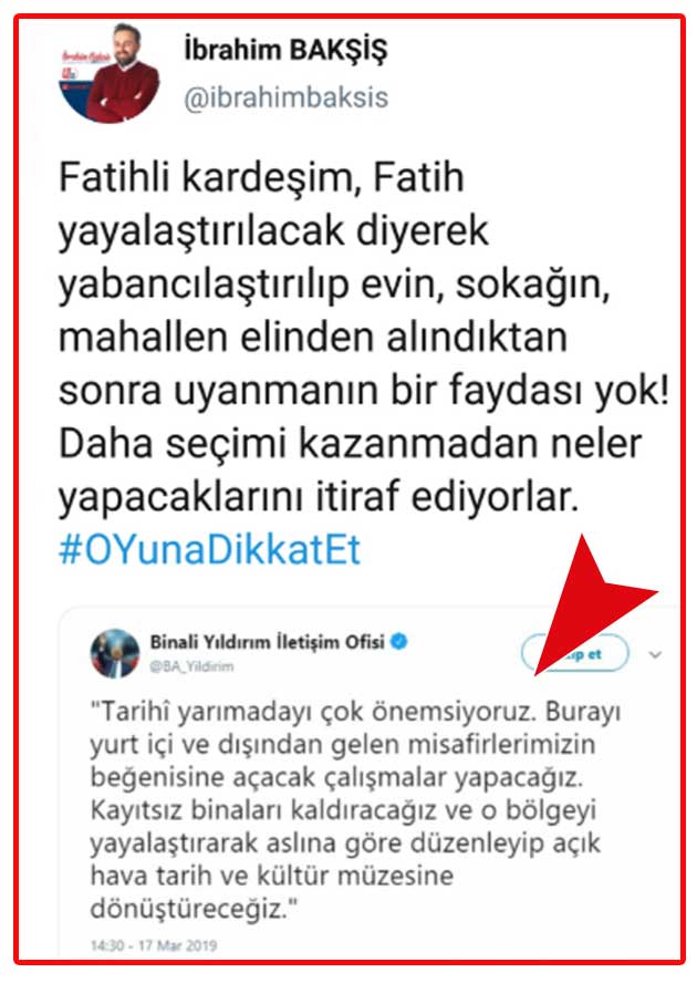 Yıldırım sosyal medyada verdiği bir vaat fatihlileri oy verirken oldukça düşündürecek. Tarihi yarımada Sur içi Fatihi yerli yabacılara açacağız, Tescil kaydı olmayan bütün binaları yıkıp yeşil alan yapacağız, Bazı yerleri tarihi aslına uygun yeniden inşa edeceğiz dedi, Burada dil sürçmesi yok niyet belli biz zaten 12 yıldır bu projelerin akıbeti böyle olacak diye yazıyorduk, Bizim burada mülkümüz yok Ama fatihte yaşamak istiyoruz, Akp kazanırsa imkanı yok demektir.