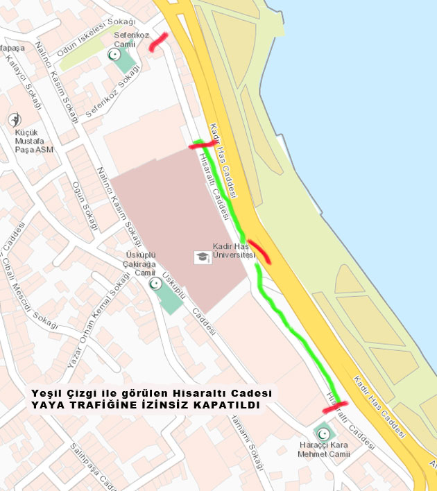 Biraz evvel 10:30 da tarafımızı telefonla arayan İBB Beyazmasa yetkilisi Kadir Has üniversitesinin Hisaraltı caddesinin yayalara kapatılmasının yasalara aykırı olduğunu, Olaydan haberimiz vesilesiyle haberdar olduklarını, İBB Zabıtanın söz konusu caddeyi yaya trafiğine açmak amacıyla olay yerine gönderildiğini beyan etti. Kendilerine teşekkür ettik. Ülkemizde ve İlçemizde hukukun üstünlüğünün her alanda yaygınlaştırılması için mücadelemiz devam ediyor.