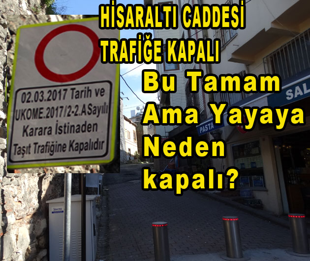 Halbuki Hisaraltı caddesinin başındaki UKOME tabelasında (02.03.2017 Tarih Ve UKOME.2017/2-2A Sayılı Karara İstinaden Taşıt Trafiğine Kapalıdır) yazıyor zaten.