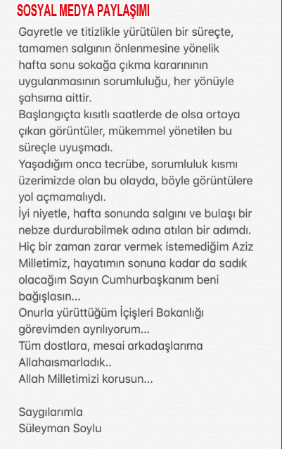 Soylu istifa açıklamasında, corona virüs tedbirleri kapsamında 31 il için alınan 2 günlük sokağa çıkma yasağı kararının ilanıyla ortaya çıkan görüntülerin aldığı kararlarla ilgili olduğunu söyledi.