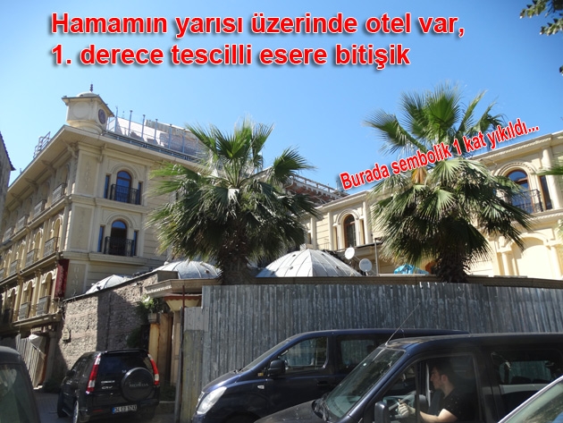 Fatih ilçesi 922 ada 119 Parsel 1/1000 ölçekli nazım imar planına göre yükseklik 9:50 olduğu yıllarda 12:50 yükseklikte, tarihi tescilli hamam yıkılarak inşa edilen, Birçok davaya neden olan, Kaçak oteli kurtarabilmek için neler yapılmamış ki!
